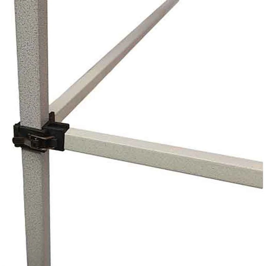 - Tradeshow kit includes: 10×10 DS Steel Frame, Canopy Top, (1) Backwall, (2) Half wall half walls, (2) rail skirt hardware, Wheeled Roller Bag, and stake and rope kit