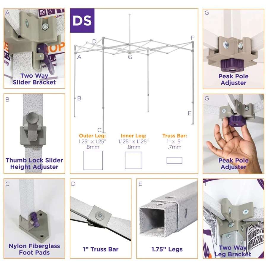 It is equipped with a premium polyester water-repellant, fire resistant canopy fabric for durable protection and long lasting enjoyment. This colorful red and white striped canopy kit features Impact Thumb-lock sliders, a textured steel frame, and durable 500-denier polyester fabric top that’s 100% fire-retardant for added safety and comes with a dust cover for convenient portability and a rope and spike kit extra stability. Its the perfect canopy for a fairgrounds concessions stand or a festive day out with the family! We have replacement parts available for all of our frames. Fixes are simple and inexpensive.