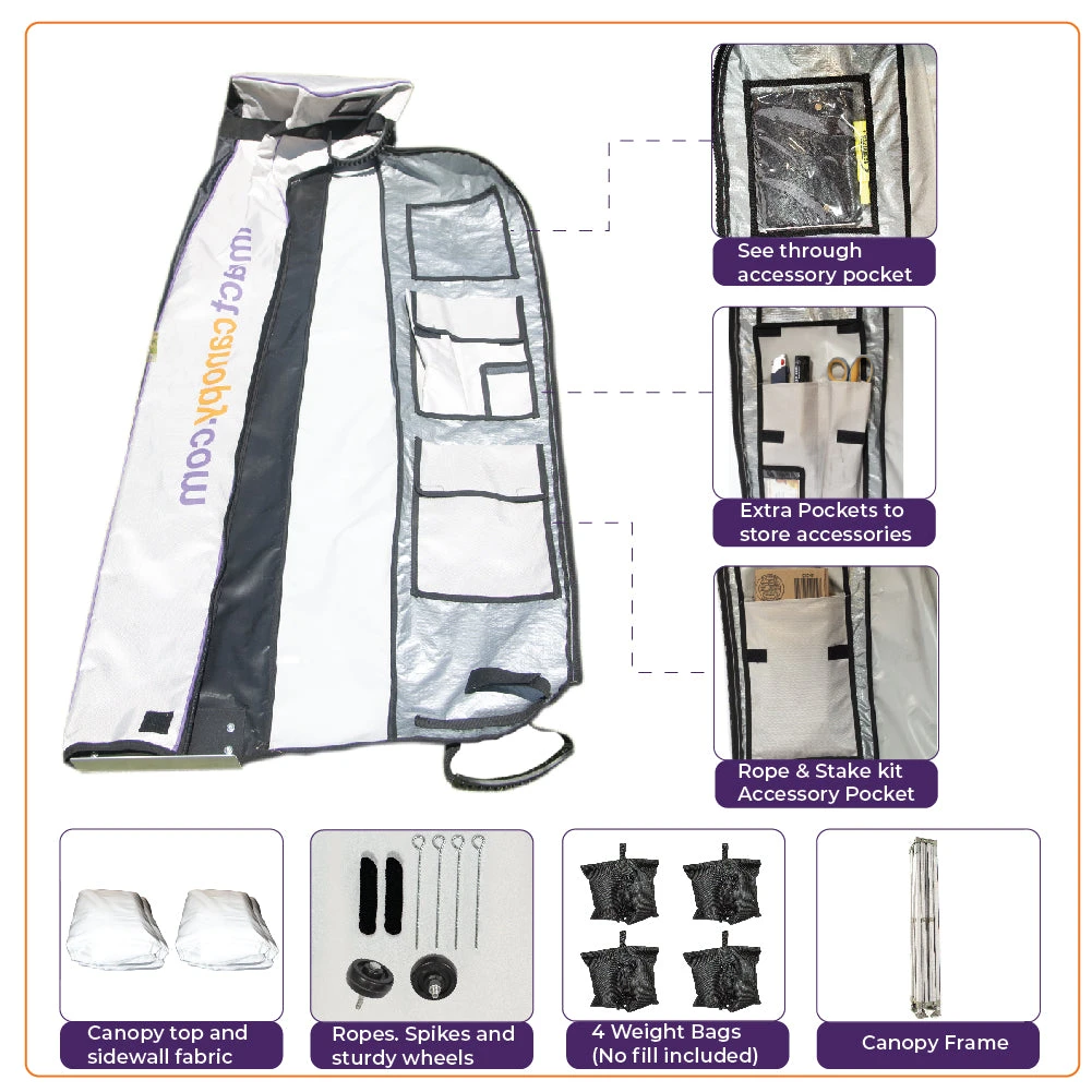 - Includes: Frame, Top, Four Sidewalls, Four Weight Bags, Rope & Spike Kit, Wheeled Roller Bag